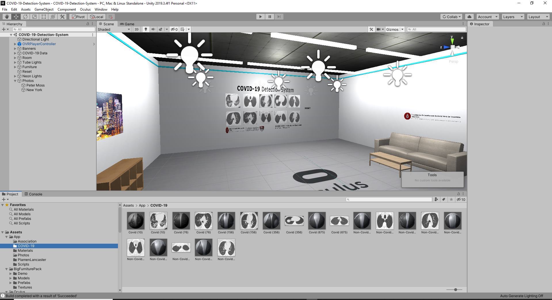 I use the trained model from COVID-19 Tensorflow DenseNet Classifier with the COVID-19 Tensorflow DenseNet Classifier For Raspberry Pi 4 and serve an API endpoint that exposes the Artificial Intelligence classifier allowing Oculus Rift to communicate with it.